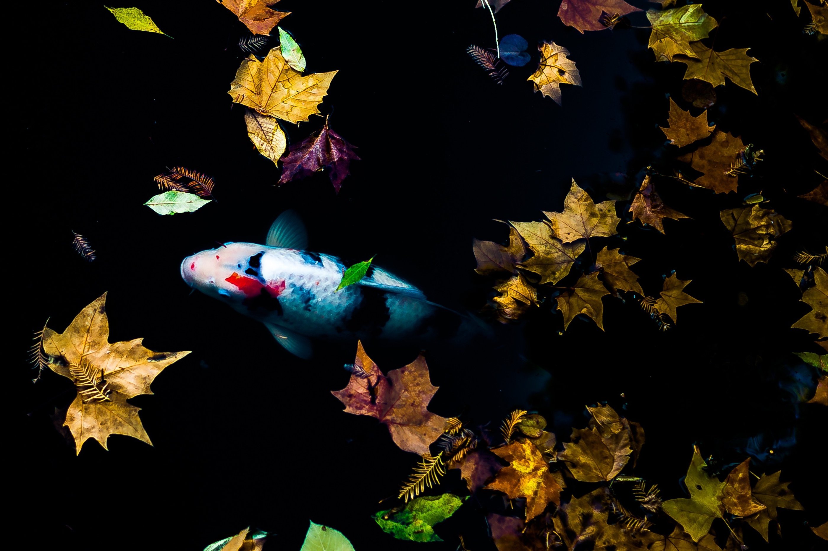 Koi "flying" in the autumn pond of the Tiananmen Square memorial garden / monument in Frankfurt am Main, Germany.