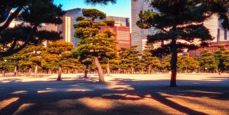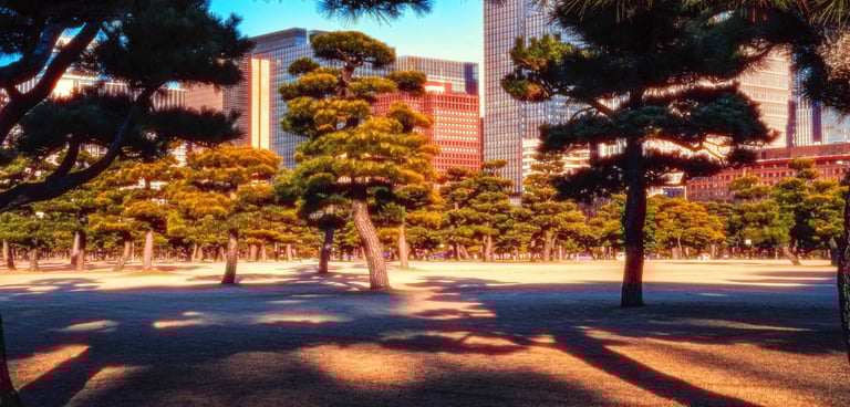 Kokyogaien National Garden in front of the Imperial Palace in Tokyo - red glow halation mood.